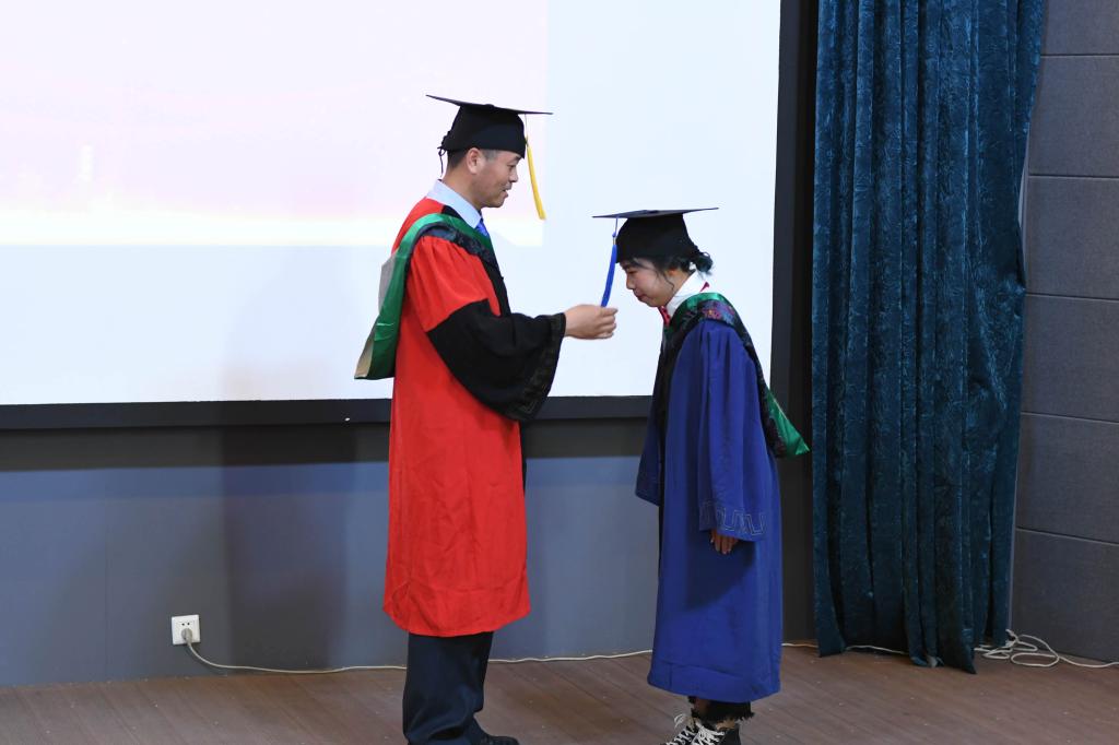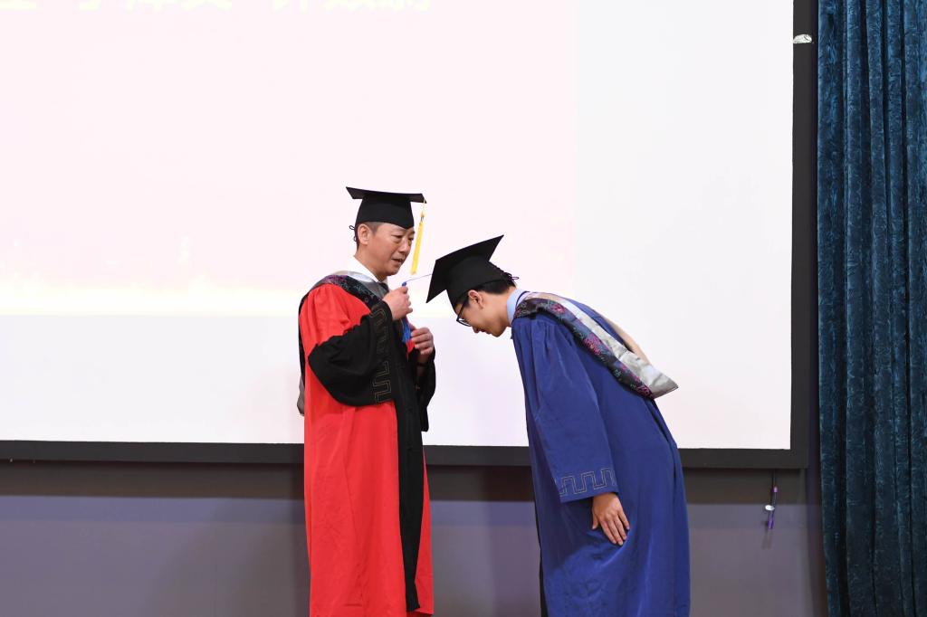 学位授予仪式在雄壮的国歌声中拉开了帷幕。公司副经理、学位分委会主席张明军教授宣读了太阳集团tyc5392020届毕业研究生授予学位名单。副经理、学位分委会副主席孙博兴教授、副主席逄大欣教授、委员任文陟教授作为主礼教授为毕业研究生拨穗正冠,经理张嘉保教授颁发学位证书。