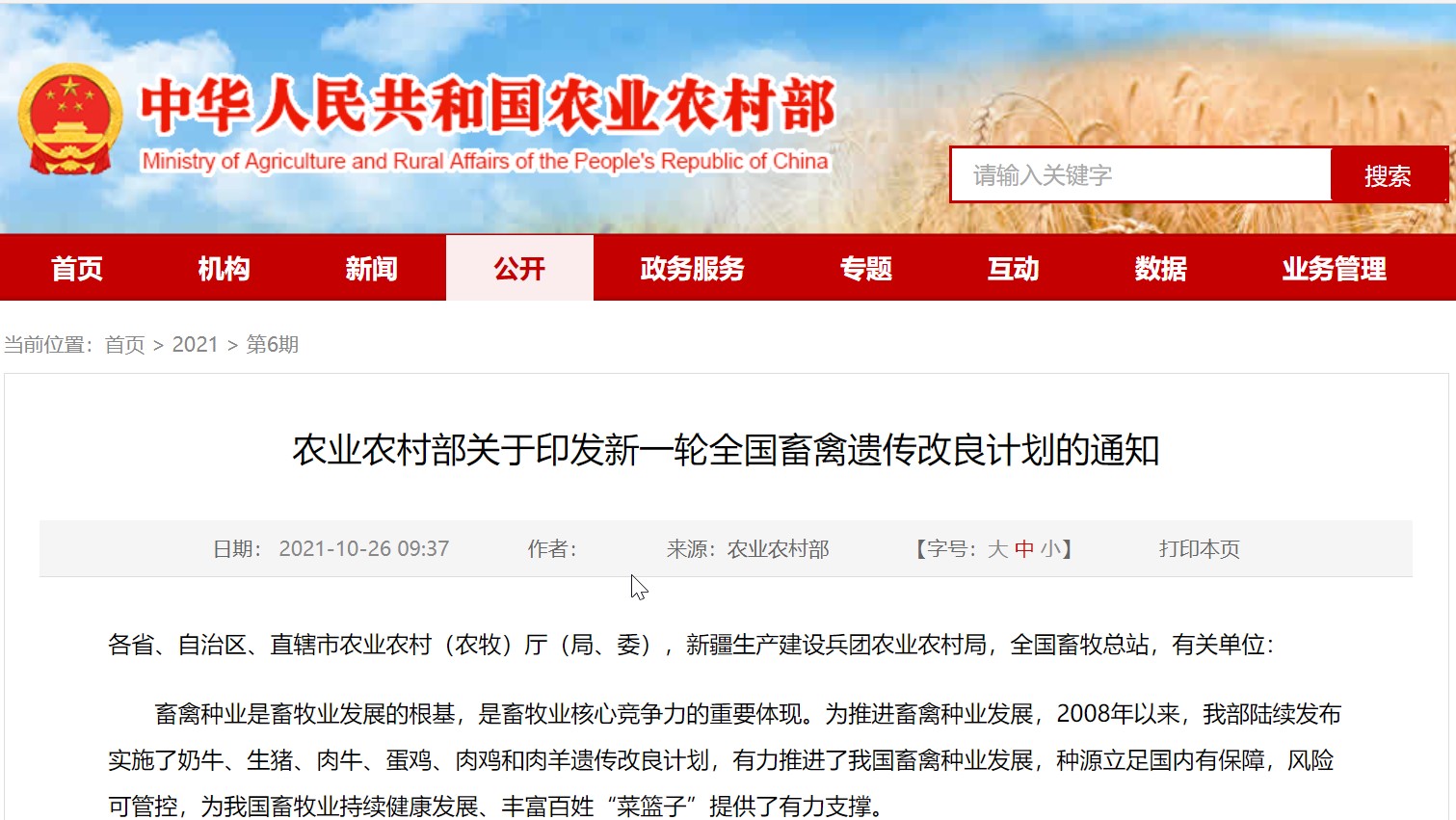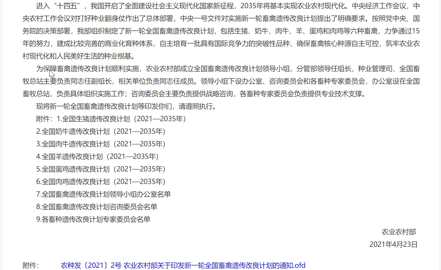 (http://www.moa.gov.cn/nybgb/2021/202106/202110/t20211026_6380483.htm 农业农村部关于印发新一轮全国畜禽遗传改良计划的通知)