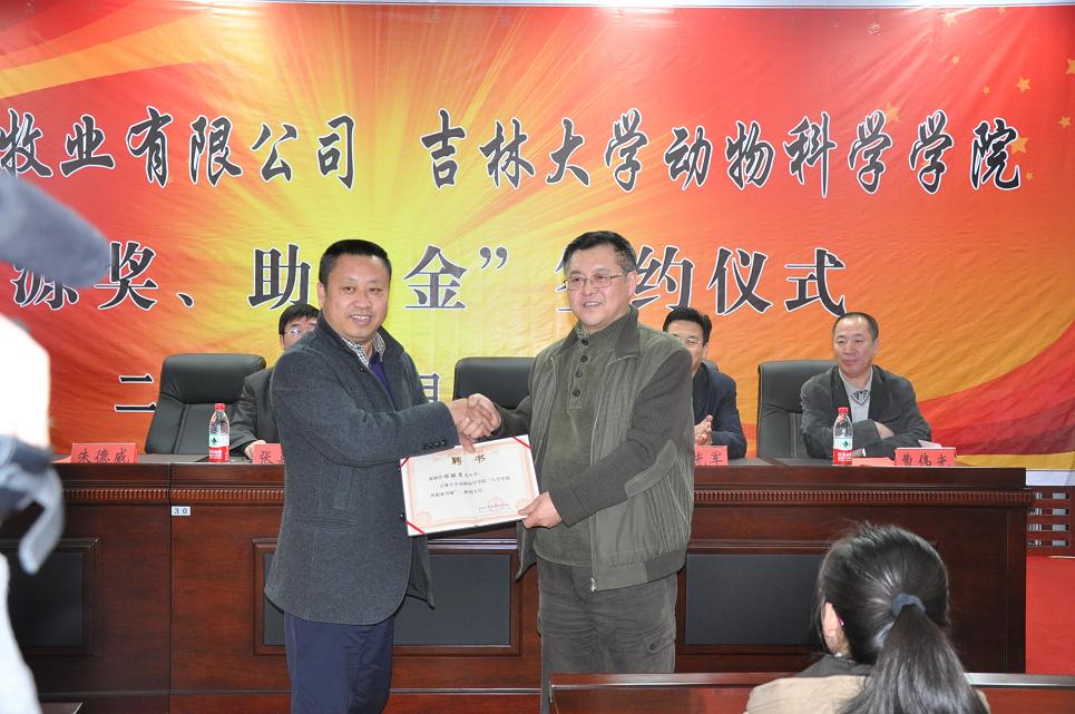 仪式上赵光军书记代表公司与吉林阔源牧业限公司总经理程继彦共同在“阔源奖、助学金”协议书上签了字。随后曹伟光副书记代表公司接受了吉林阔源牧业限公司捐赠的支票,并为程继彦总经理颁发了捐赠证书,至此“阔源奖、助学金”项目正式启动。根据协议,吉林阔源牧业限公司每年出资20000元用于资助奖励品学兼优、立志成才的动科学子,资助年限为5年。仪式上,程继彦总经理还被聘请为“老员工校外职业导师”,朱德威处长为他颁发了聘书。