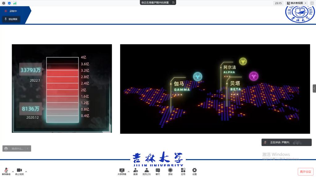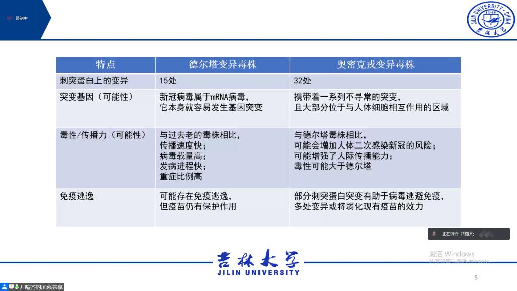 其次,尹暄齐老师以本次引起长春本次疫情的新冠毒株奥密克戎为切入点,向大家普及了奥密克戎毒株与德尔塔、贝塔变异毒株的差异,尤其是其传播速度和免疫逃逸能力。他提醒大家要做好自身防护,并建议同学们在疫情结束后尽快接种疫苗加强针,还就个人防护、学习生活对大家提出要求。