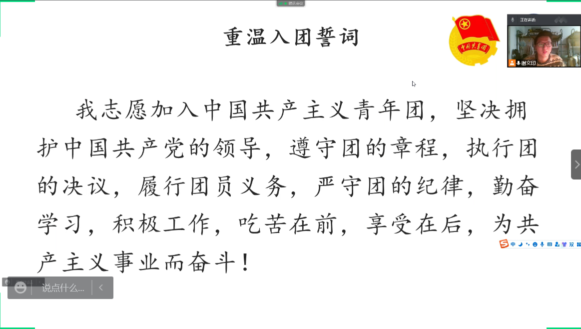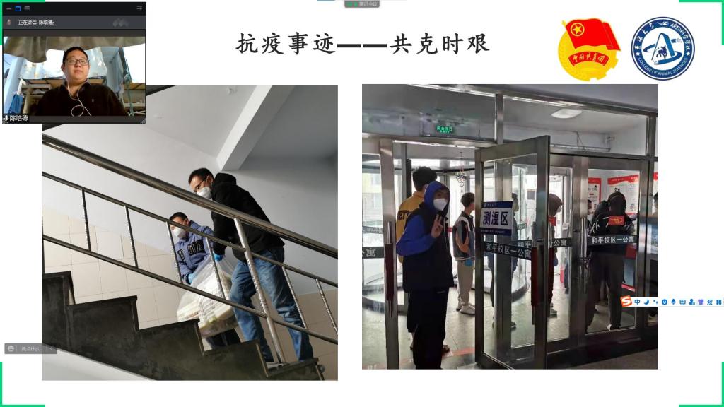 在会议上,我们邀请了卢忠宇、潘惠豪等团员代表分享了抗疫的体会和心得,他们身先士卒,成为了迎难而上的先行者,他们负责着同学们一日三餐的配送、核酸检测组织工作。“哪有什么岁月静好,不过是有人替你负重前行”,正是有了这些无私奉献的志愿者才能保证一日三餐、饮用水、水果总是能准时送到每位同学手里。在这场没有硝烟的战争中,我们青年一代成为了疫情第一线的主力军。正如习主席说的“一代人有一代人的长征,一代人有一代人的担当”。我们正身处一个后疫情时代,抗疫阵前,每个人都应“躬身入局”。青年要视国事为己任,贡献自己能及的一份力量,在疫情中书写青年人的担当,是誓言,更是责任!