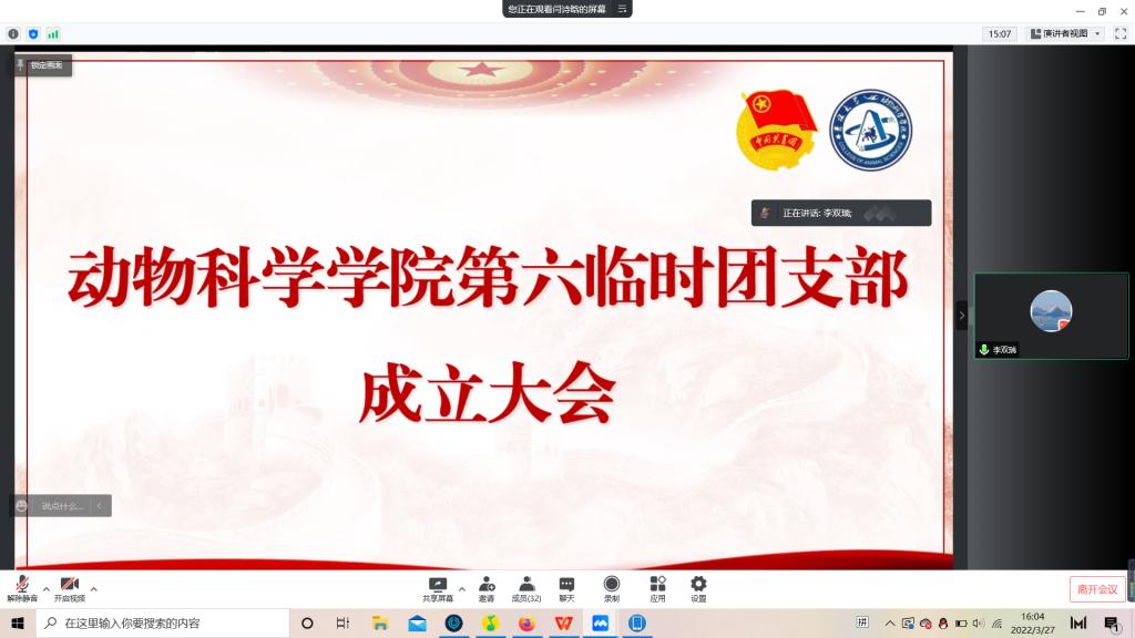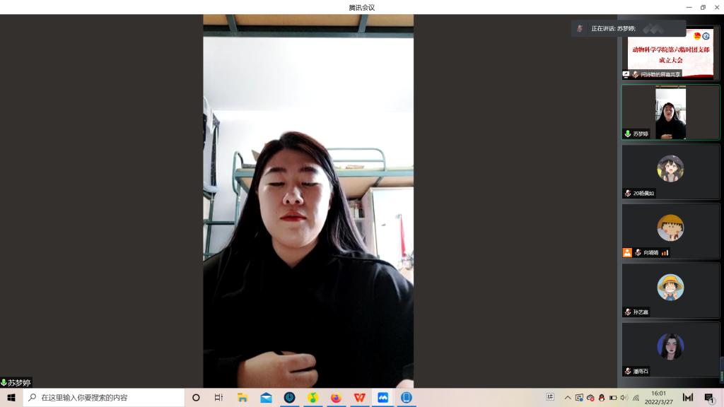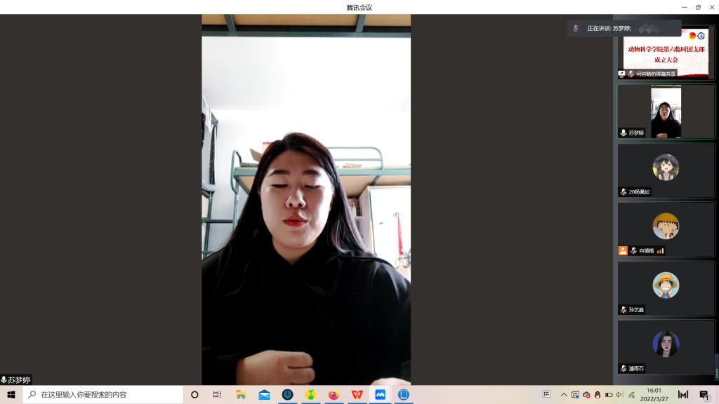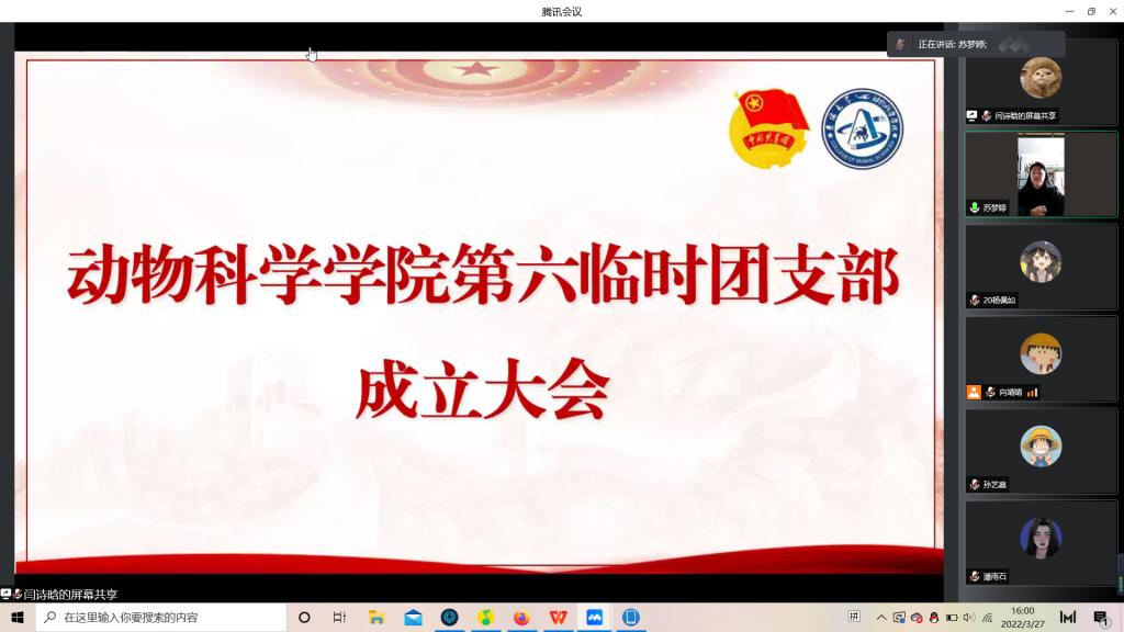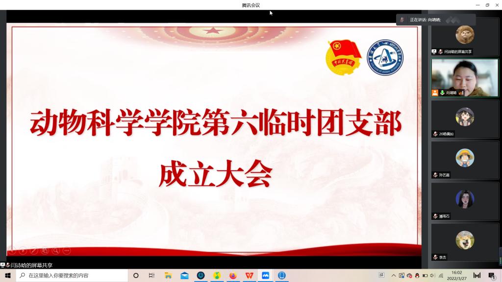 为积极响应校团委号召,强化团的基层建设,切实发挥共青团组织在防疫控疫工作中的战斗堡垒作用及团员的先锋模范作用,落实《关于疫情防控期间成立临时团支部的通知》的工作安排,公司第六临时团支部成立大会于3月29日下午四点由支部书记苏梦婷主持召开。支部全体成员即2018级、2019级实验动物班和2020级一班和平二公寓共34名同学参会。