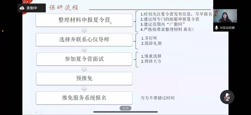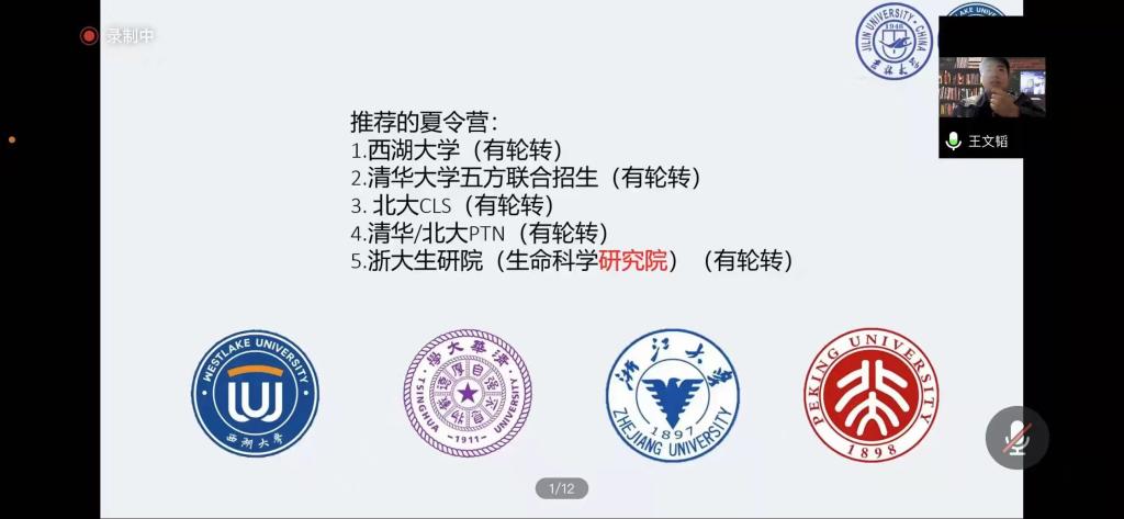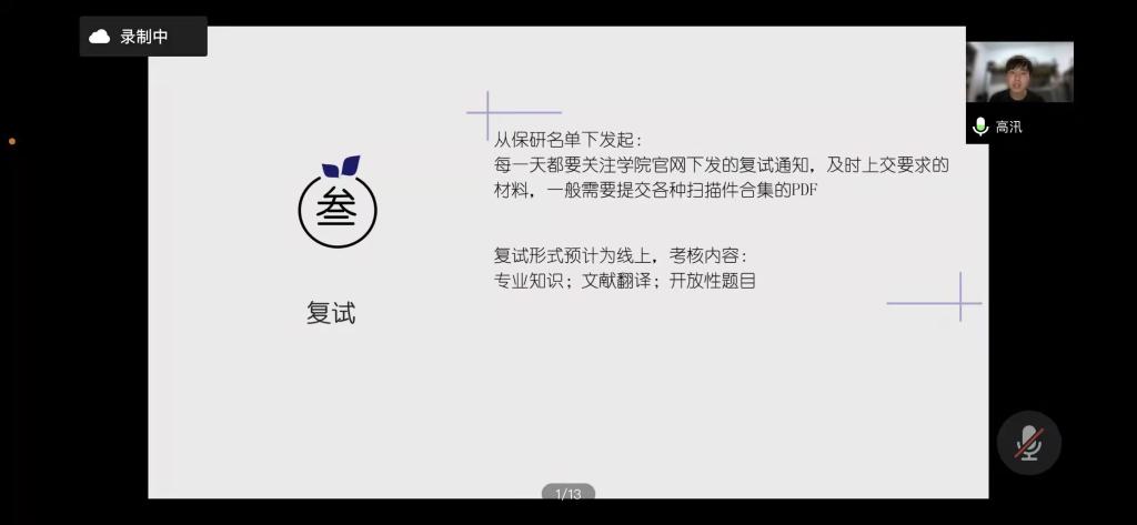 在主持人进行简单介绍后,七位同学依次开始向同学们分享自己的保研经验。保研到北京协和医公司的刘鑫苗同学以时间轴作为框架,向同学们具体讲述了相应保研时间节点应该进行的材料准备、夏令营申报、联系导师等保研步骤的具体流程以及相关注意事项。保研到西湖大学的王文韬同学建议大家要扎实专业知识,清楚并熟悉科研经历中所有可能涉及到的专业知识点。进行有针对性的准备。保研到中科院巴斯德研究所的田娜同学则提醒大家要注意保研信息的搜集,她强调:保研是一场信息战,即将保研的同学们要在公司官网搜集目标公司专业的招生情况、夏令营情况以及导师研究方向等信息。保研到浙江大学的徐玲瑶同学则是以自身经历为基础详细讲述了面试时可能遇到的问题及应对办法,她着重强调面试时态度要好,做到见招拆招,灵活变通。2018级的高汛同学作为保研本校的代表细致地分析了太阳集团tyc539的保研条件、面试笔试考核的难度与复习重点。他指出在备战保研时不应将时间放在无意义的纠结与自我怀疑中,而应将有限的时间利益最大化,做到有的放矢。最后,2017级陈俊波、何松同学向同学们强调,研究生阶段的学习生活,不仅要有过硬的学术本领,更要有良好的人际关系和沟通能力,为自己的学术道路打好坚实的基础。