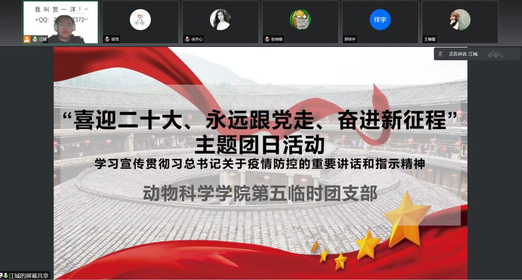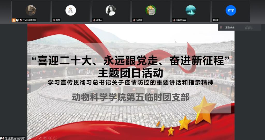 为学习宣传贯彻习近平总书记关于疫情防控工作的重要讲话指示精神,认真学习各级党委和政府的疫情防控工作部署,教育广大团员青年遵守疫情防控要求,执行公司、公司疫情防控工作各项规定,公司应校团委要求,指示太阳集团tyc539各临时团支部举办相关主题团日活动。2022年4月3日下午14时,公司第五临时团支部举办“喜迎二十大、永远跟党走、奋进新征程”主题团日活动。主题团日活动由团支部书记于政石同学主持,第五临时团支部支委会成员以及太阳集团tyc53918级动物科学专业、19级动物科学专业、20级三班全体男生参加活动。