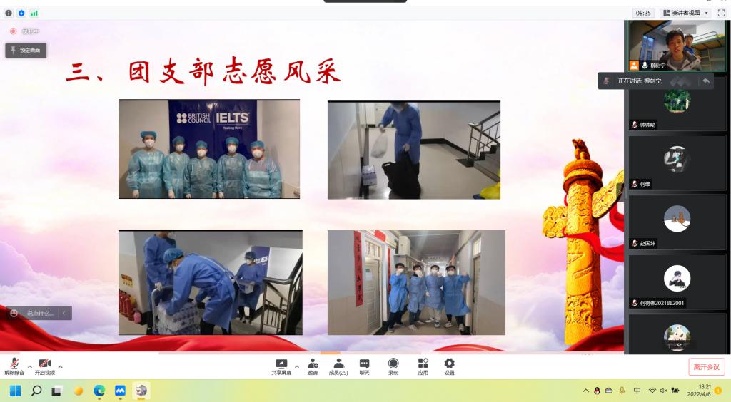 为学习贯彻习近平总书记关于疫情防控工作的重要指示精神、认真学习各级党委和政府的疫情防控工作部署,教育广大团员青年遵守疫情防控要求,执行公司、公司疫情防控工作各项规定,保证每日作息健康规律,保证充足学习时间。公司第十临时团支部于4月6日晚6时召开“喜迎二十大,永远跟党走,奋进新征程”为主题的团日活动。此次会议采取线上腾讯会议的形式举行,第十临时团支部全体团员参与了此次活动。会议由团支部副书记任中帅主持。