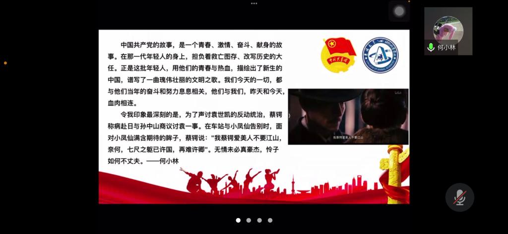 何小林同学则是分享了电影中令她印象最深刻的剧情:为了声讨袁世凯的反动统治,蔡锷称病赴日与孙中山商议讨袁一事。在车站与小凤仙告别时,面对小凤仙满含期待的眸子,蔡锷说:"我蔡锷爱美人不要江山,奈何,七尺之躯已许国,再难许卿"。她赞叹说蔡锷“无情未必真豪杰,怜子如何不丈夫”,当个人家庭和国家事业相矛盾的时候,当家人亲属和人民群众的利益相冲突的时候,他毫不犹豫地选择了后者。