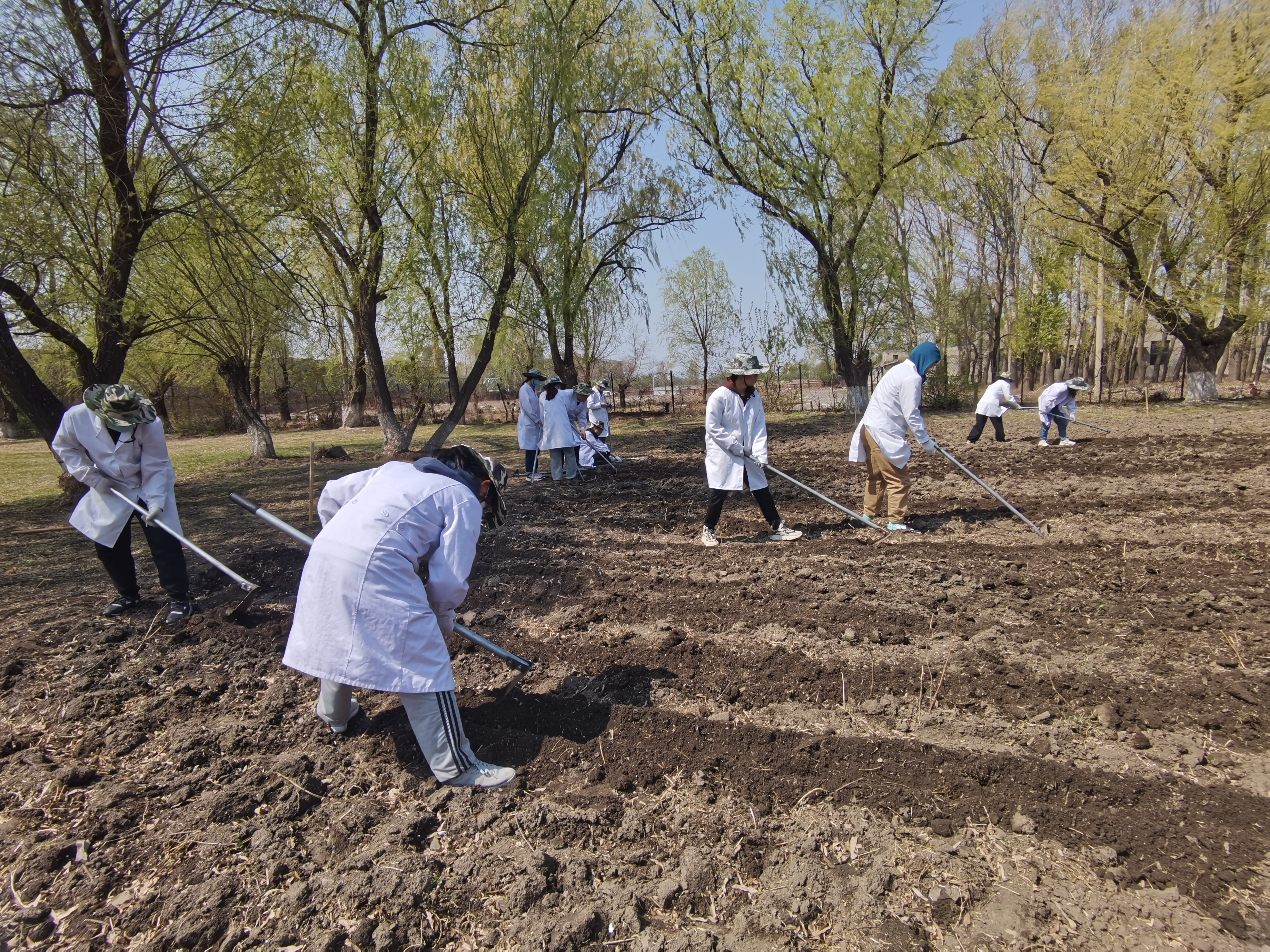 在活动开始的前一天,两名专业课教师为大家讲述了劳动的动作要领及相关注意事项,为同学们分配任务,引导员工正确使用劳动用具。在活动过程中,两位老师亲自拿起锄头,为大家示范起垅的动作要领,讲述每个步骤在牧草生长过程中所起到的作用。活动第一天上午9时,全体人员准时到齐,在专业课老师的带领下前往领取劳动用具,同学们分成六组,每组4人,当天完成了清除杂草的工作。同学们分工明确、默契十足、全心全意投入其中,先后完成了翻耕整地、起垄播种等工作。