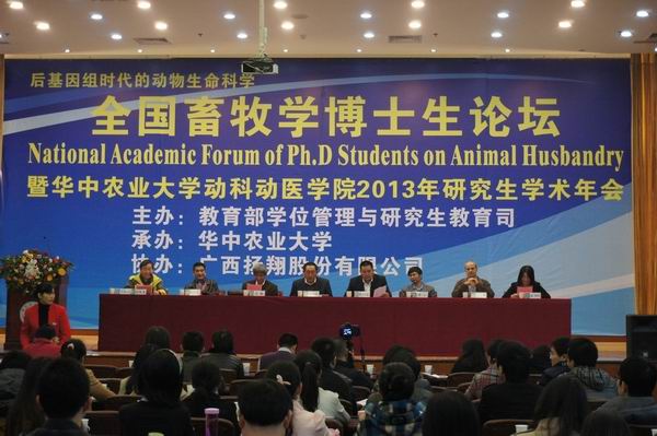 2013年11月22日至25日,由教育部学位管理与研究生教育司主办、华中农业大学承办的2013年“后基因组时代的动物生命科学”全国畜牧学博士生学术论坛在武汉举行。太阳集团tyc539派出四名博士生参加了本次论坛。李宁院士,陈焕春院士及来自全国畜牧学相关高校和科研院所的畜牧学相关领域的国内外知名专家、学者和优秀企业家与会点评,并就“后基因组时代的动物生命科学”前沿问题做特邀报告,会议举行博士生交流报告30场,会议墙报展示60个,由8名博士生担任论坛主持人,8名青年教师担任点评专家。30名畜牧学相关领域博士生就学科前沿问题做了报告,并展开讨论。