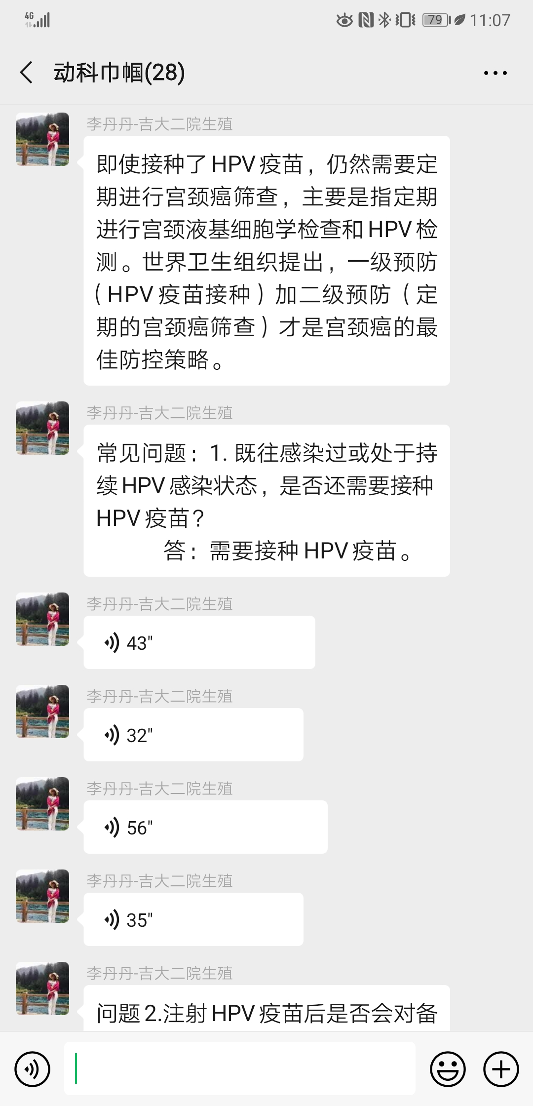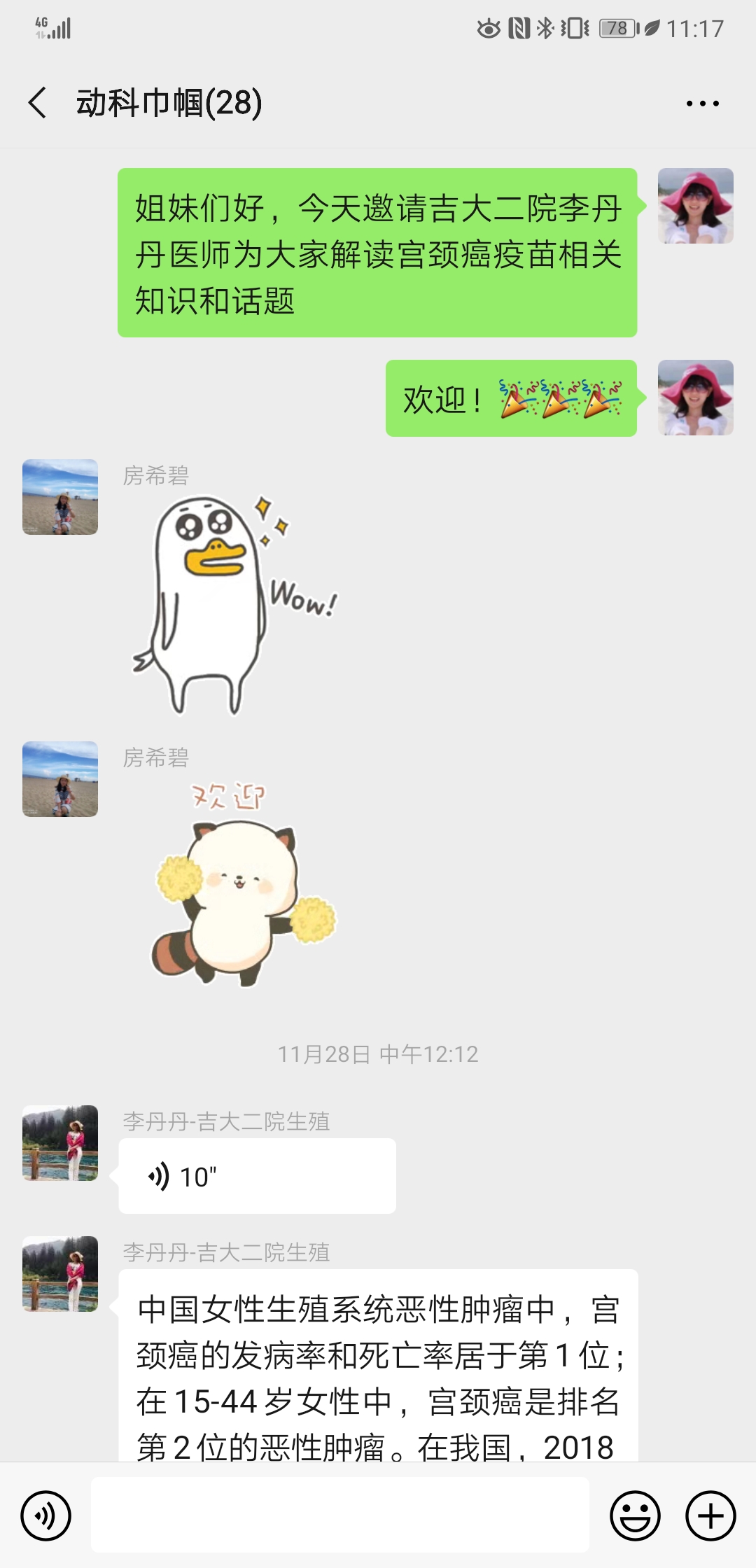 宫颈癌疫苗目前国内有3种不同价型,如何进行合适的选择?针对这一热点问题,2019年11月28日中午,动物科学妇委会邀请公司第二医院李丹丹医生为全院女教职工开展了微信专题活动,详细解答了宫颈癌发病与诊疗现状、应对策略、宫颈癌疫苗分类及选择方法,用详实的数据、丰富的资料和专业的讲解为女教职工奉献了一次以宫颈癌为主题的知识盛宴,详细指导了女教职工如何进行宫颈癌的预防与疫苗接种选择。活动中公司女教职工针对相关问题与李丹丹博士进行了热烈讨论,并得到了细致耐心的解答。部分姐妹通过公司妇委会架设的沟通桥梁与专家李丹丹医师取得联系,进行了进一步的沟通咨询。