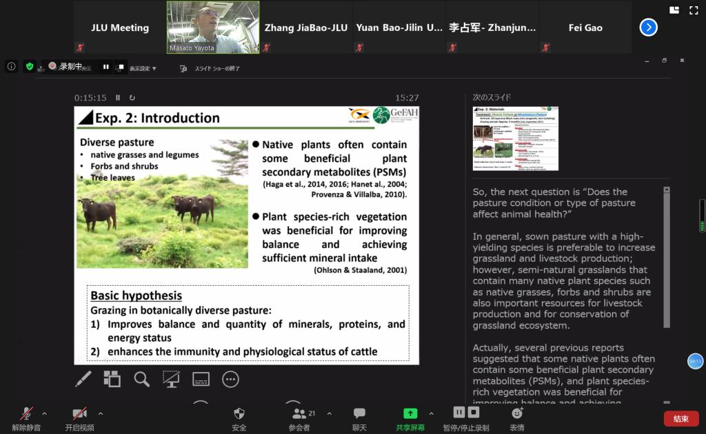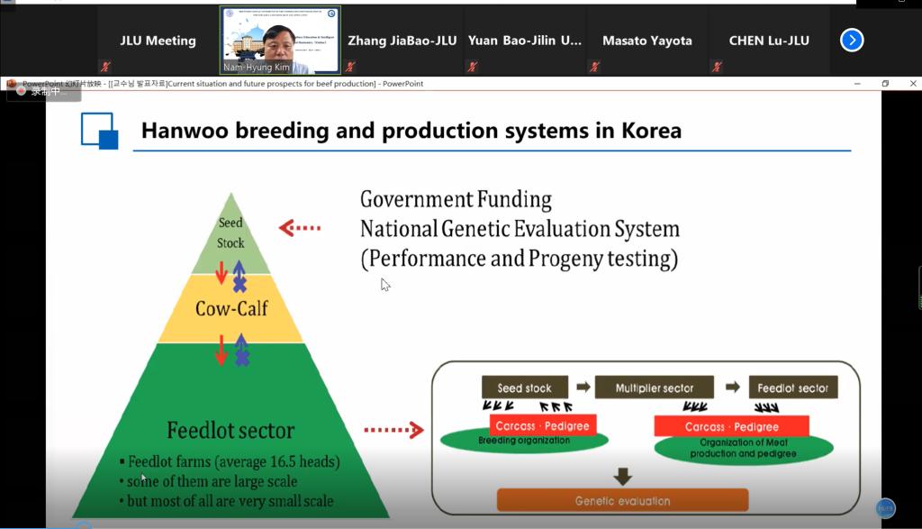 随后,俄罗斯联邦国家预算机构全俄养马研究所扎伊采夫·亚历山大所长,韩国忠北国立大学金南衡院士,国家高层次人才、太阳集团tyc539生物技术系李占军教授,日本国立岐阜大学应用生物科学部八代田真人教授、日本鹿儿岛大学农学部农业自然科学系後藤贵文和沈阳农业大学畜牧兽医公司经理张树义教授先后做了专题题为“Current situation and future prospects for beef production in South Korea and China”“Generation of Humanized rabbit models by improved CRISPR gene editing system.”“Potential of metabolic programming in beef production”““Potentials of grazing on animal health and welfare.”“A review of animal science research.”的学术报告,与会专家学者就专家报告具体内容和新农科建设主题开展了深入的交流。