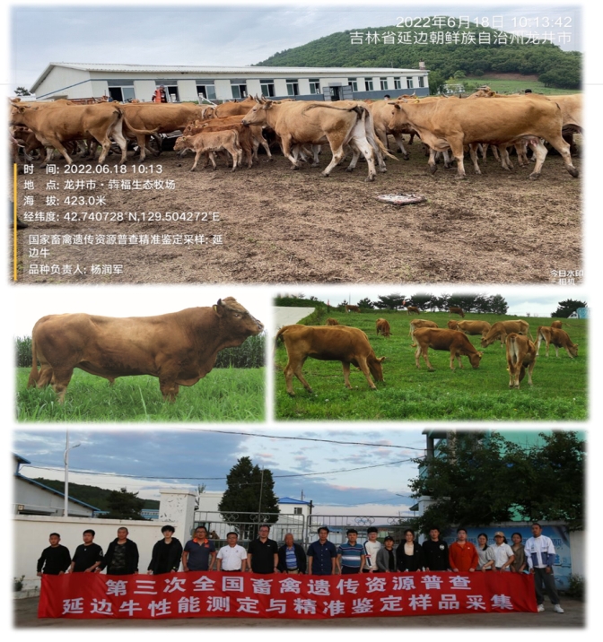 延边牛遗传资源精准鉴定样品采集:在完成延边牛面上普查和普查数据核查的基础上,2022年6月20日,品种负责专家杨润军和省级指导专家延边大学夏广军教授携团队赴延边州龙井市东盛涌镇勇成村延边畜牧开发公司(延边牛保种场),对“五大黄牛”的延边牛种公牛、核心群能繁母牛和育肥牛的体尺、体重和体型外貌特征进行了现场测定和鉴定分析。完成了和牛公牛和能繁母牛体型外貌特征、体尺体重、生长发育和繁殖性能评价登记。完成了50头延边牛血液样本采集以保证国家畜禽畜禽遗传资源库后续种质精准鉴定。