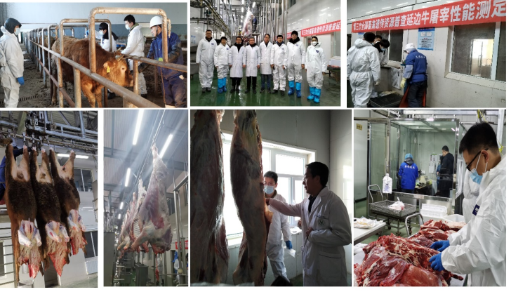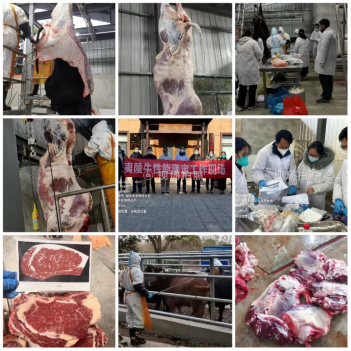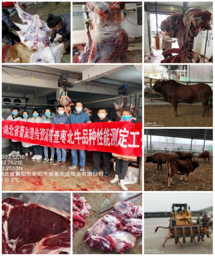 枣北牛育肥、屠宰和肉质性能测定:2022年12月15-17日,团队赴湖北省枣阳市枣北县杨当镇振泰天龙牧业有限公司进行枣北牛屠宰测定。2022年12月15日测定了枣北牛育肥去势公牛和母牛的初测体重、终测体重、日增重3个育肥性能指标。2022年12月16日上午完成了10头育肥枣北牛去势公牛的屠宰测定工作,分别测定了10头育肥枣北牛的宰前活重、胴体重、净肉重、骨重、屠宰率、净肉率、肉骨比、肋骨对数、眼肌面积共9个屠宰性能指标。2022年12月17日对10头枣北牛胴体进行分割,完成了屠宰夷陵牛的肌肉大理石花纹、肉色、脂肪颜色、嫩度、pH和肌肉系水力等6个肉质性能指标测定工作。