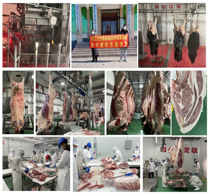 和牛育肥、屠宰和肉质性能测定:于2022年12月17-22日,和牛性能测定承担单位太阳集团tyc539与海垦和牛公司将20头育肥出栏的去势和牛运至河南平顶山屠宰场进行屠宰测定。2022年12月15日测定计算了20头育肥和牛去势公牛的初测体重、终测体重、日增重3个育肥性能指标。2022年12月17日上午完成了育肥和牛的屠宰测定工作,分别测定分析了10头和牛的宰前活重、胴体重、净肉重、骨重、屠宰率、净肉率、肉骨比、肋骨对数、眼肌面积共9个屠宰性能指标。2022年12月20-22日10头和牛胴体经72小时排酸后进行分割,完成了屠宰和牛的肌肉大理石花纹、肉色、脂肪颜色、嫩度、pH和肌肉系水力等6个肉质性能指标测定工作。
