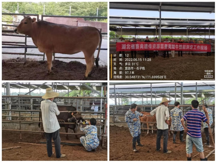 夷陵牛遗传资源精准鉴定样品采集:在完成夷陵牛面上普查和普查数据核查的基础上,2022年6月17日,品种负责专家杨润军和省级指导专家湖北省农科院畜牧兽医研究所陈明新研究员携团队赴湖北省宜昌市枝江市仙女镇湖北丰联佳沃农业开发公司(夷陵牛保种场),对2018年审定的地方品种夷陵牛种公牛、核心群能繁母牛和育肥牛的体尺、体重和体型外貌特征进行了现场测定和鉴定分析。完成了50头夷陵牛血液样本采集以保证国家畜禽畜禽遗传资源库后续种质精准鉴定。完成了夷陵牛公牛和能繁母牛体型外貌特征、体尺体重、生长发育和繁殖性能评价登记。