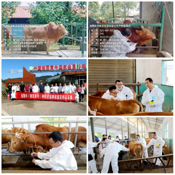 巫陵牛遗传资源精准鉴定样品采集:在完成主要分布于湖北、贵州、湖南和重庆四省区巫陵牛面上普查和普查数据核查的基础上,2022年6月14日,品种负责专家杨润军和省级指导专家湖南省畜牧兽医研究所张佰忠研究员携团队赴湖南省湘西土家族苗族自治州花垣县德农牧业公司(巫陵牛保种场),对巫陵牛(湘西黄牛)种公牛、核心群能繁母牛和育肥牛的体尺、体重和体型外貌特征进行了现场测定和鉴定分析。完成了50头巫陵牛血液样本采集以保证国家畜禽畜禽遗传资源库后续种质精准鉴定。完成了巫陵牛公牛和能繁母牛体型外貌特征、体尺体重、生长发育和繁殖性能评价登记。