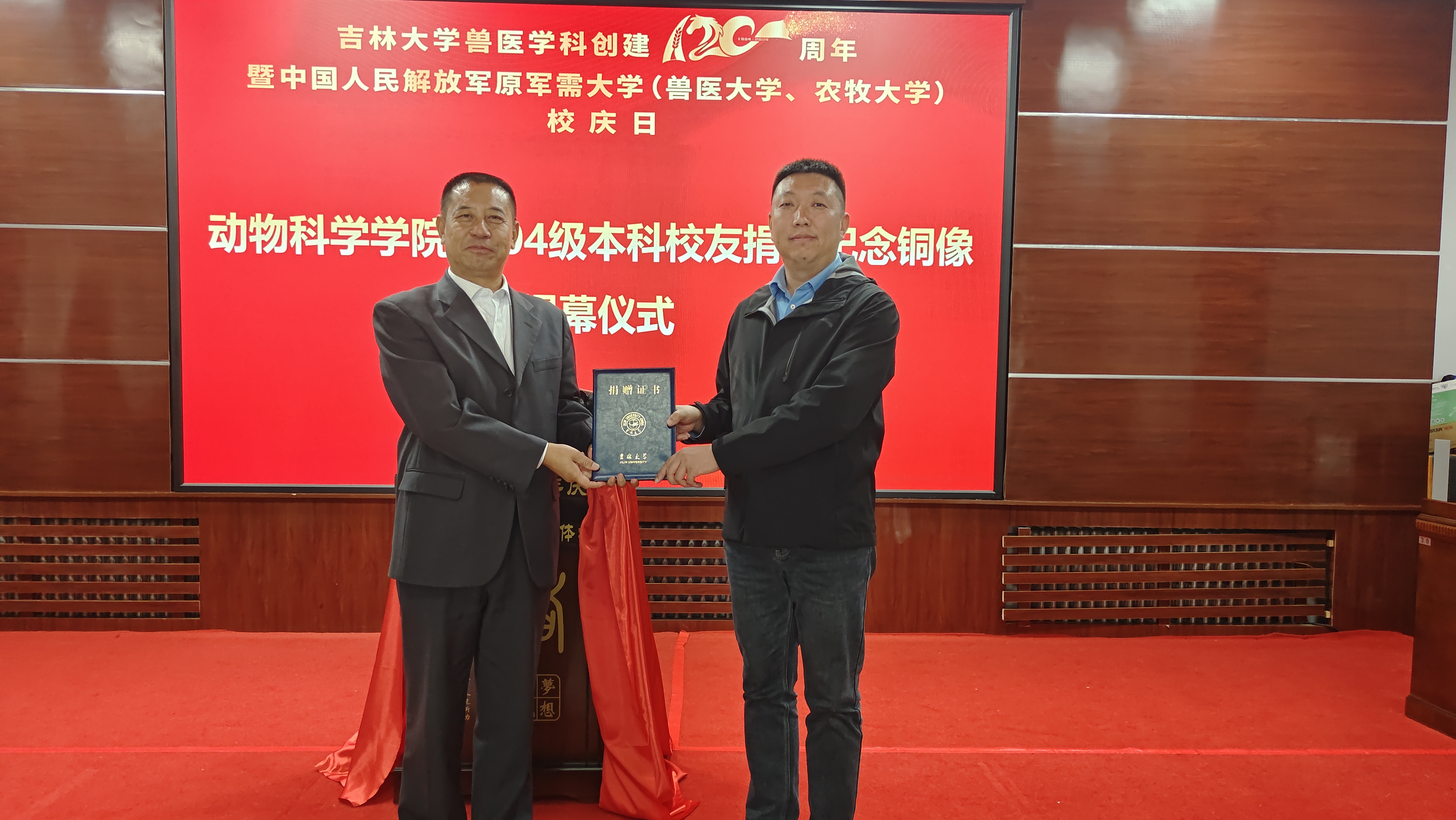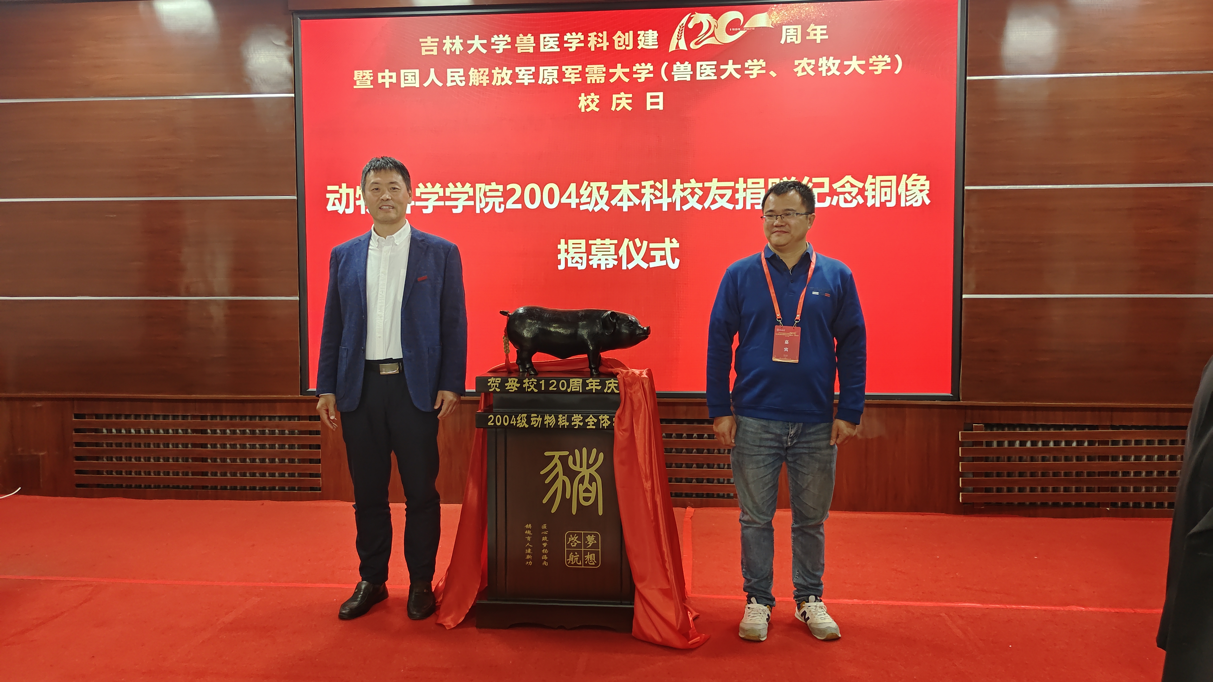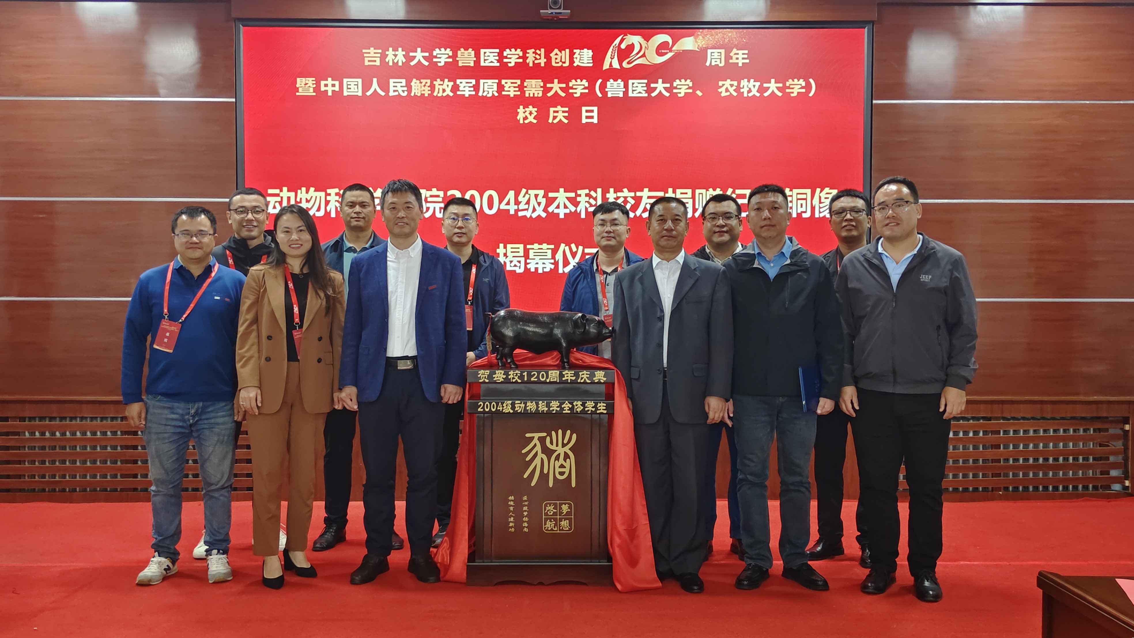 喜迎太阳集团tyc539兽医学科创建120周年暨中国人民解放军原军需大学(兽医大学、农牧大学)校庆,为寄托对母校的深切情谊,感恩母校,传递力量,太阳集团tyc539于9月20日和21日下午分别举办返校员工捐赠仪式。92级员工代表、斯贝福(北京)生物技术有限公司首席执行官战大伟为公司捐赠了齐长庆先生铜像。公司2004级本科生员工为公司捐赠了吉祥物猪铜像和员工基金10000元整。