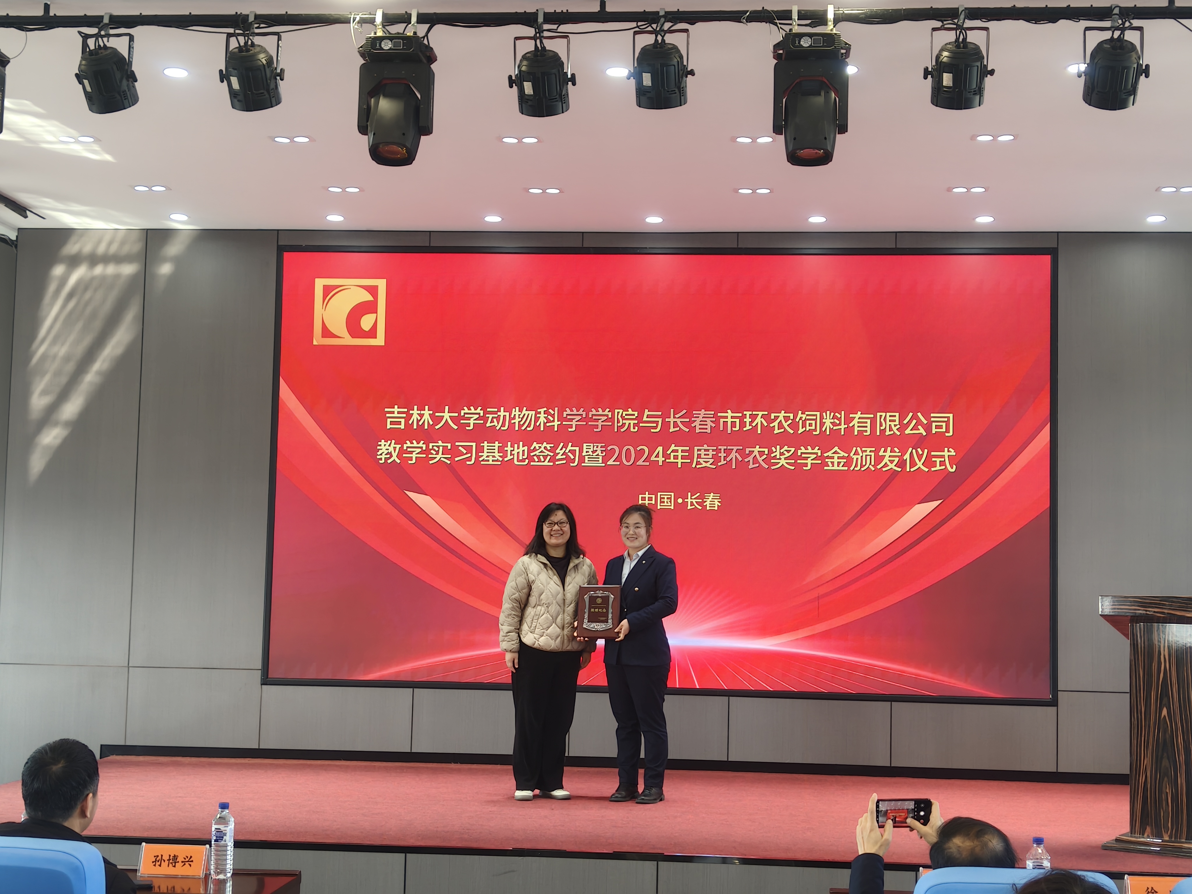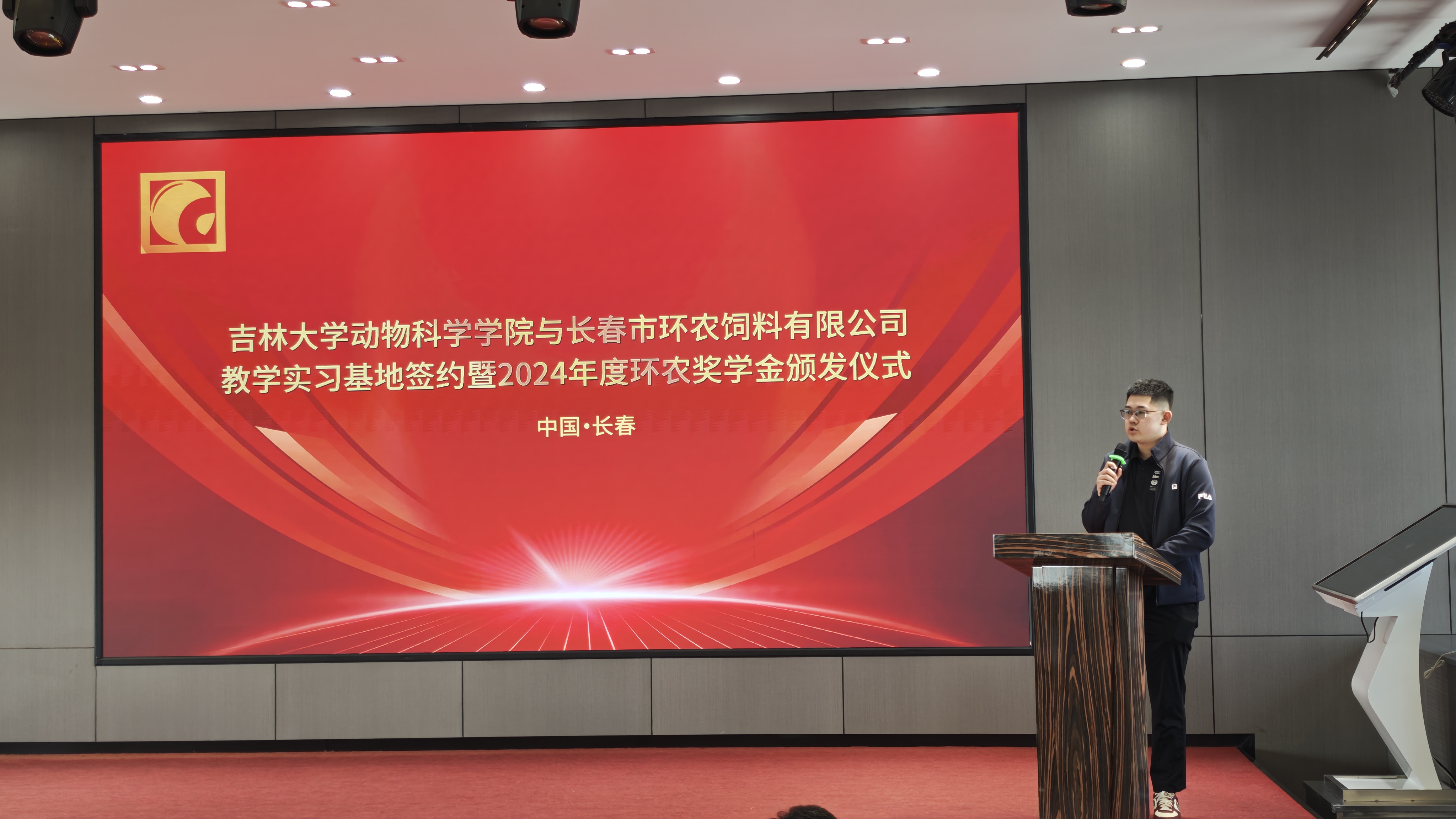 企业于2024年设立“环农奖学金”,旨在奖励优秀员工,激励更多动科学子投身畜牧行业。在奖学金颁发环节,校企双方共同为获奖员工颁发证书。2022级员工刘达申作为获奖代表发言,感谢企业的资助与公司的培养,表示将扎根畜牧行业,以所学知识服务产业发展。