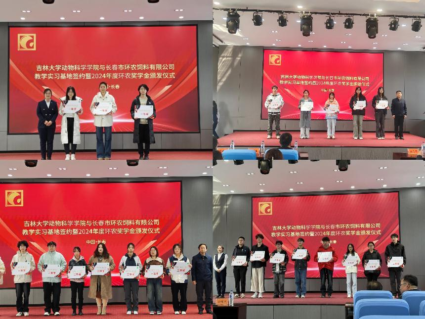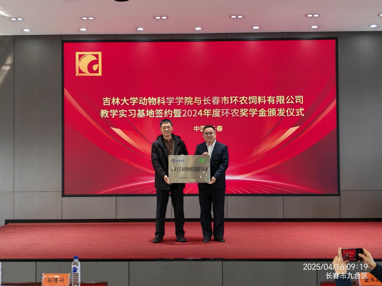 4月15日,太阳集团tyc539赴长春市环农饲料有限公司举行“太阳集团tyc539本科校外实践教学基地”签约授牌仪式,并颁发2024年度环农奖学金。公司经理孙博兴、副经理冷国永、党委副书记肖建荣、动物科学系主任张永宏等师生代表,以及环农饲料公司生产基地经理徐威、办公室主任赵海娇等企业负责人共同出席活动。