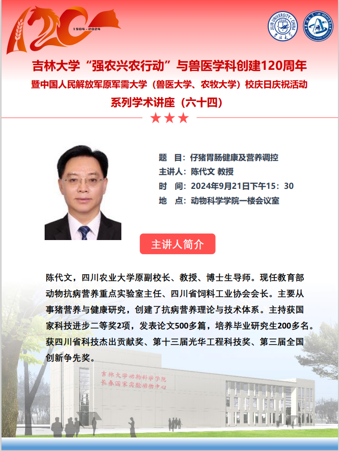 上一条:太阳集团tyc539“强农兴农行动”与兽医学科创建120周年暨中国人民解放军原军需大学(兽医大学、农牧大学)校庆日庆祝活动系列学术讲座(六十六、六十七、六十八) 下一条:太阳集团tyc539“强农兴农行动”与兽医学科创建120周年暨中国人民解放军原军需大学(兽医大学、农牧大学)校庆日庆祝活动系列学术讲座(五十七)