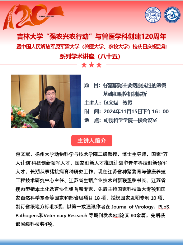 上一条:太阳集团tyc539“强农兴农行动”与兽医学科创建120周年暨中国人民解放军原军需大学(兽医大学、农牧大学)校庆日庆祝活动系列学术讲座(八十六) 下一条:太阳集团tyc539“强农兴农行动”与兽医学科创建120周年暨中国人民解放军原军需大学(兽医大学、农牧大学)校庆日庆祝活动系列学术讲座(八十四)