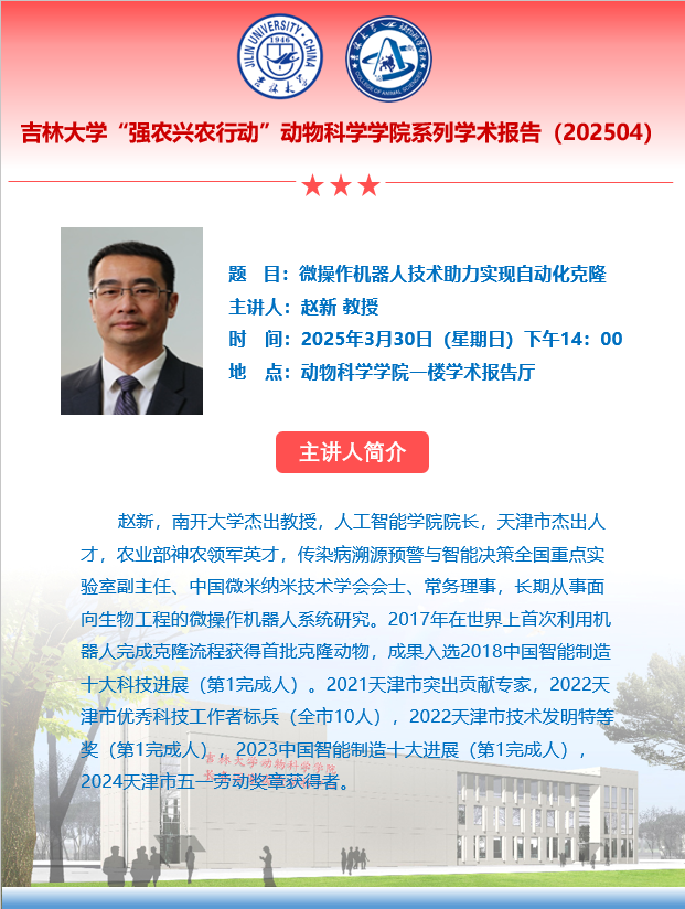 赵新,南开大学杰出教授,人工智能公司经理,天津市杰出人才,农业部神农领军英才,传染病溯源预警与智能决策全国重点实验室副主任、中国微米纳米技术学会会士、常务理事,长期从事面向生物工程的微操作机器人系统研究。2017年在世界上首次利用机器人完成克隆流程获得首批克隆动物,成果入选2018中国智能制造十大科技进展(第1完成人)。2021天津市突出贡献专家,2022天津市优秀科技工作者标兵(全市10人),2022天津市技术发明特等奖(第1完成人),2023中国智能制造十大进展(第1完成人),2024天津市五一劳动奖章获得者。