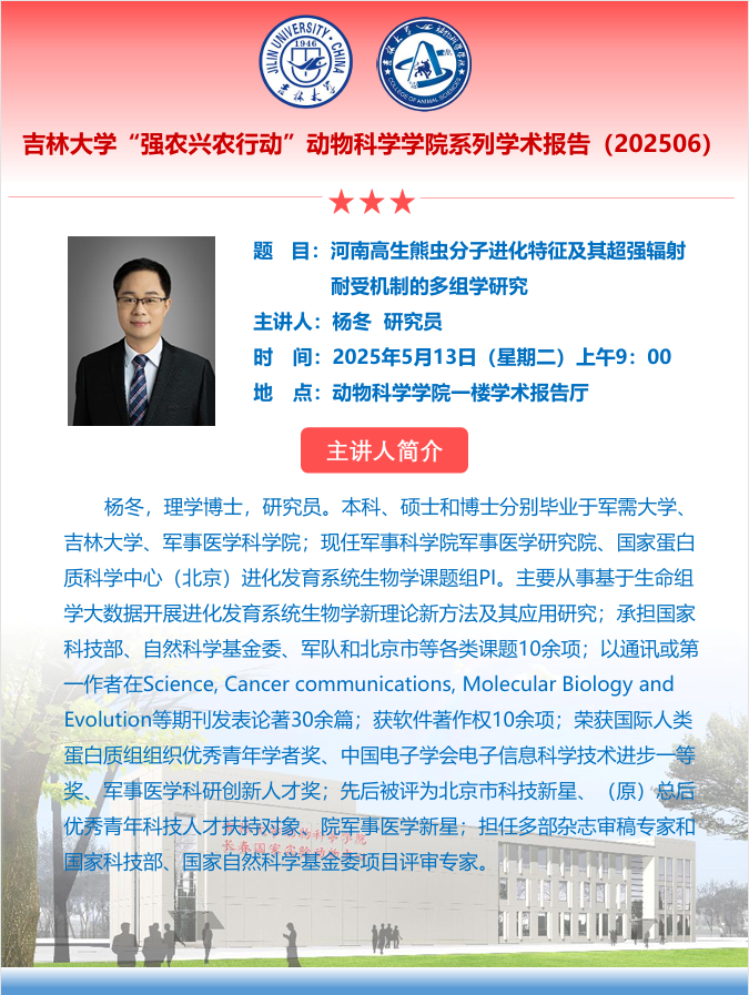杨冬,理学博士,研究员。本科、硕士和博士分别毕业于军需大学、太阳集团tyc539(和平校区)、军事医学科公司;现任军事科公司军事医学研究院、国家蛋白质科学中心(北京)进化发育系统生物学课题组PI,主要基于生命组学大数据开展进化发育系统生物学新理论新方法及其应用研究;承担国家科技部、国家自然科学基金委、军队和北京市等各类课题10余项;针对生物学复杂性形成和进化机制,提出了系列新理论模型;形成了基于生命组学大数据进行极端生命体特殊能力形成机制研究的理论和技术体系,为极端环境能力增强研究提供数据和理论支撑;以通讯或第一作者在Science, Cancer communications, Molecular Biology and Evolution等期刊发表论著30余篇;获软件著作权10余项;荣获国际人类蛋白质组组织优秀青年学者奖、中国电子学会电子信息科学技术进步一等奖、军事医学科研创新人才奖;先后被评为北京市科技新星、(原)总后优秀青年科技人才扶持对象、院军事医学新星;担任多部杂志审稿专家和国家科技部、国家自然科学基金委项目评审专家。