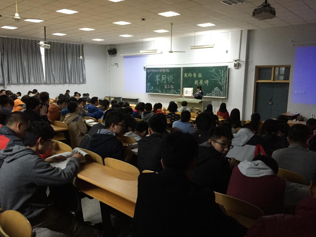 2015年4月2日,周四下午四点,2014级全体本科生齐聚科学讲堂200教室,以热烈的掌声欢迎本期嘉宾2011生物技术(动物)专业的王一名学姐和2012级生物技术(动物)专业的吴志竞学姐参加本次分享会。